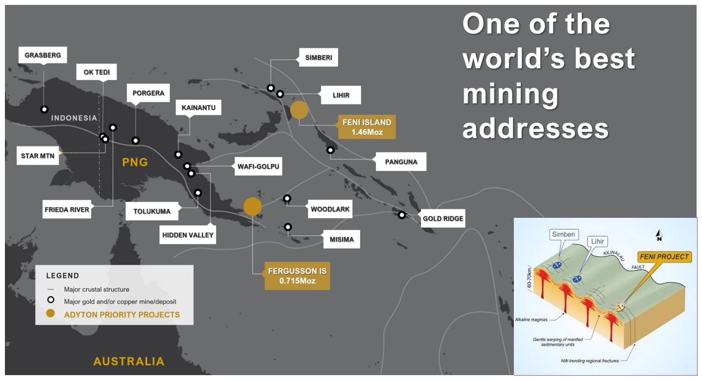 Adyton’s projects are located on the Pacific Ring of Fire, on accessible island settings that host several globally significant deposits including the Lihir gold mine and Panguna copper-gold mine on Bougainville Island, both in close proximity to Feni, highlighting the district-scale potential of the Company’s land package.