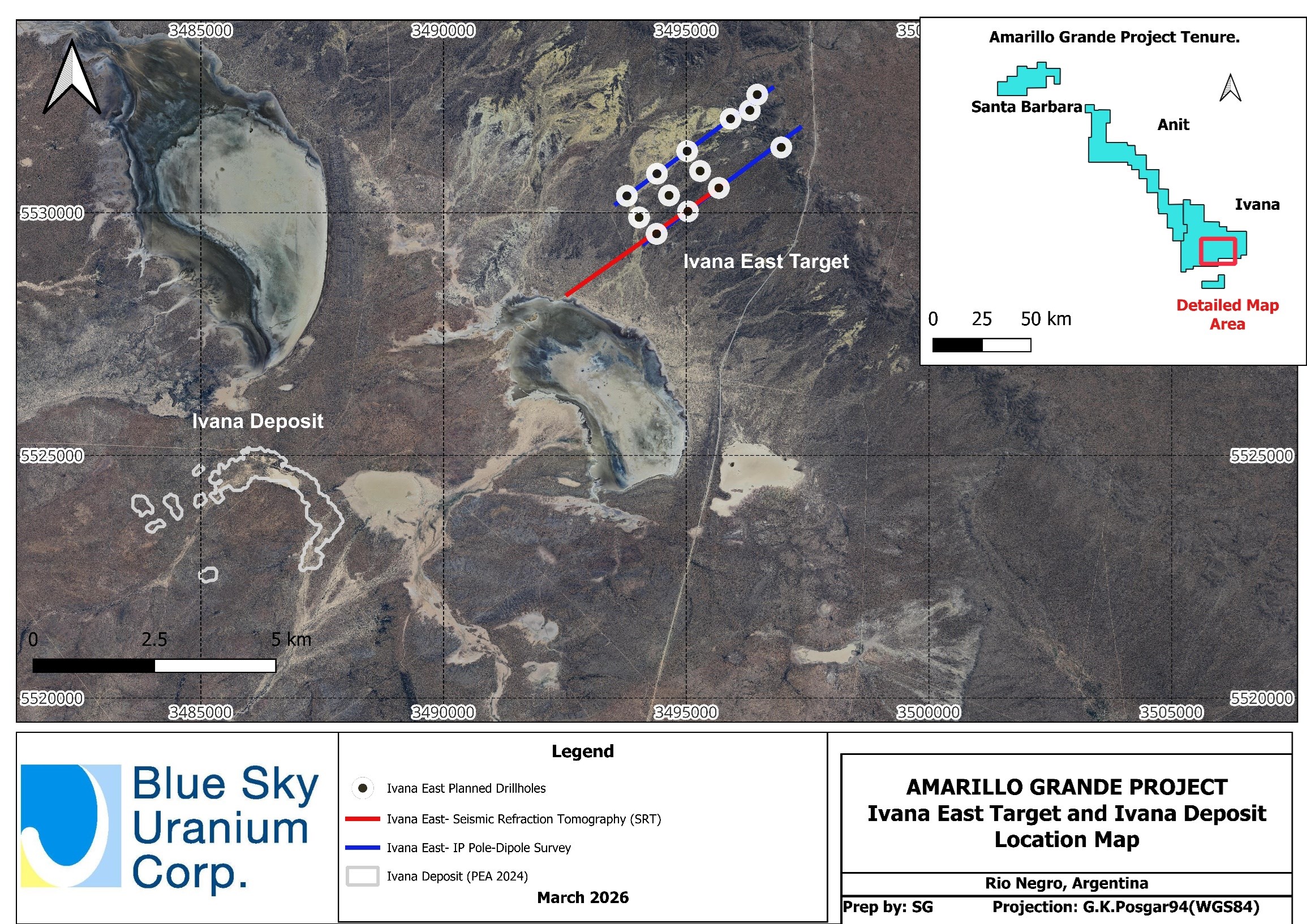 Vancouver, British Columbia–(Newsfile Corp. – April 7, 2026) – Blue Sky Uranium Corp. (TSXV: BSK) (FSE: MAL2) (OTCQB: BKUCF) (“Blue Sky” or the “Company”) and its joint-venture operating company, Ivana Minerales S.A. (“IMSA“), are pleased to announce the commencement of a new 1,200 metre diamond drilling (“DDH“) exploration program at the Ivana East target, located approximately 10 kilometres northeast of the Ivana uranium-vanadium deposit within the Company’s flagship Amarillo Grande Project in Rio Negro Province, Argentina (see Figure 1 below).