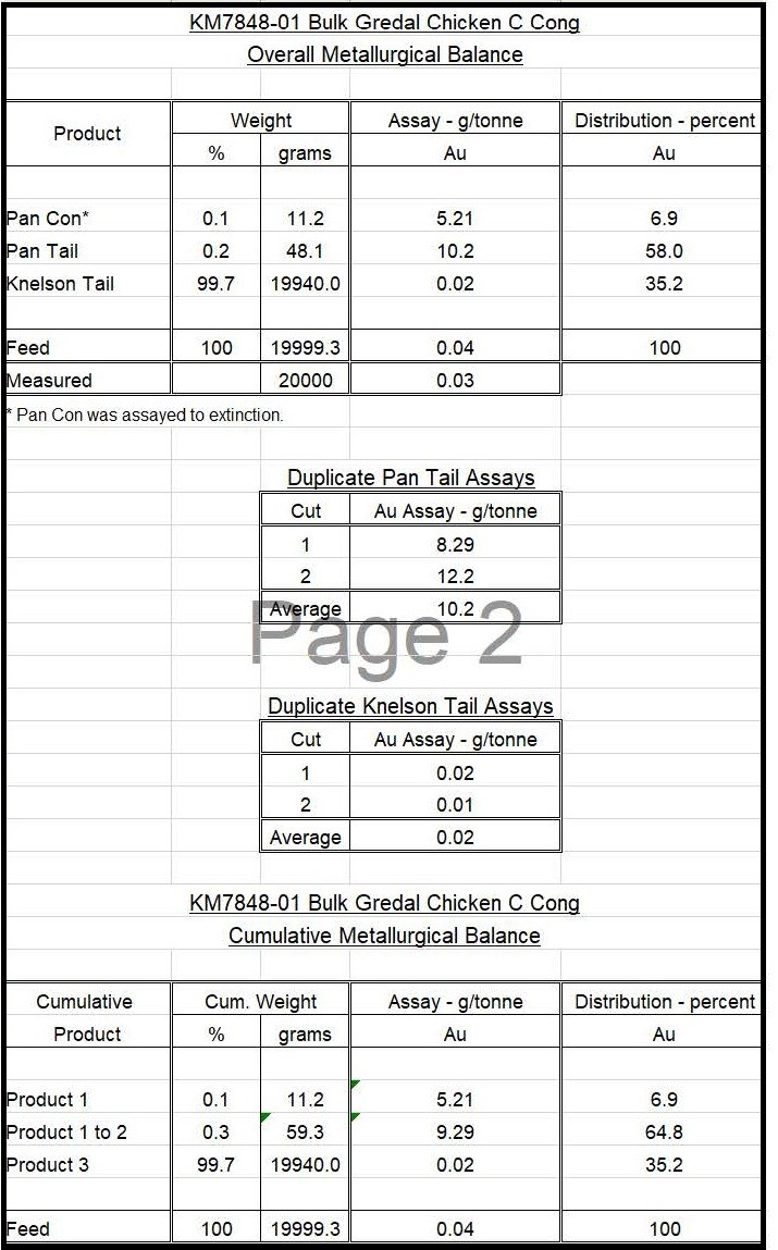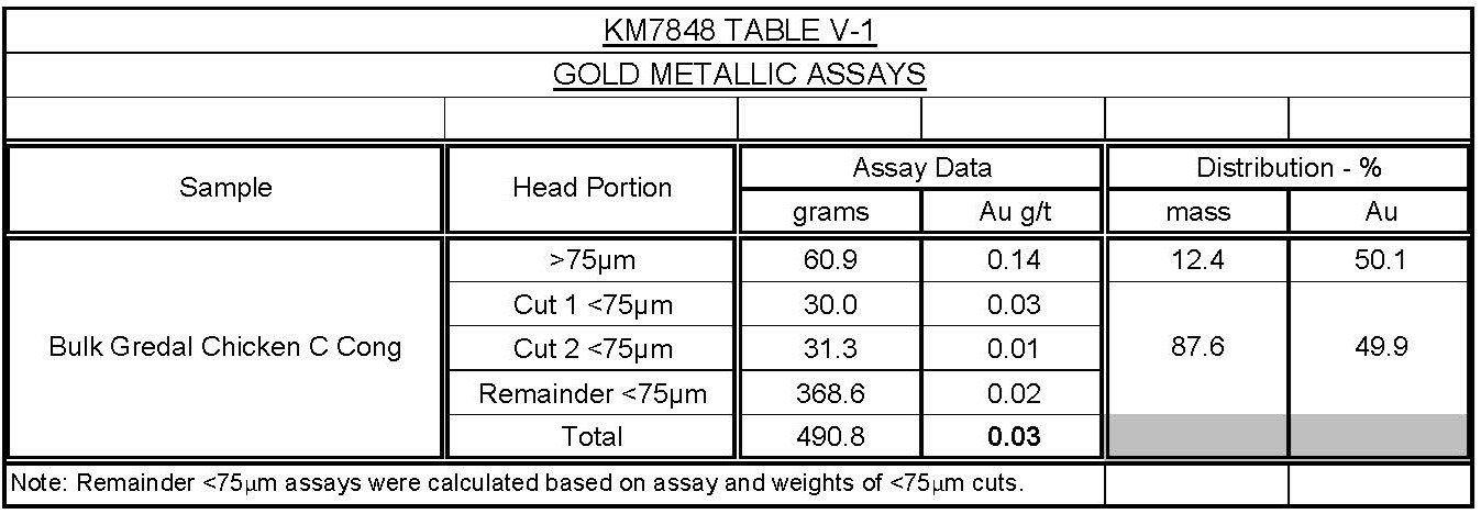 The Knelson Separation Test produced a Pan Concentrate weighing 11.2g, representing 0.1% of the 20kg sample, and assayed 5.21g/t Au, containing 6.9% of the Au in the sample. The Pan Tails were 48.1g representing 0.2% of the sample, and assayed 10.2g/t Au, containing 58.0% of the Au in the sample. The Knelson Tails were 19.9993kg representing 99.7% of the sample and assayed 0.02g/t Au representing 35.2% of the Au in the sample. The weighted average gold concentration of the 20kg bulk sample was thus 0.03g/t Au (Table 3).