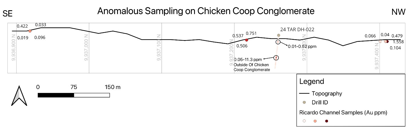 The Chicken Coop Conglomerate itself has locally returned significantly elevated Au concentrations (Figure 2), particularly over 813 meters in its southeastern portion (Figure 2).