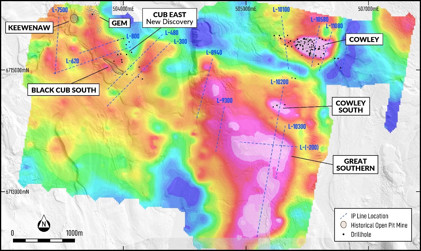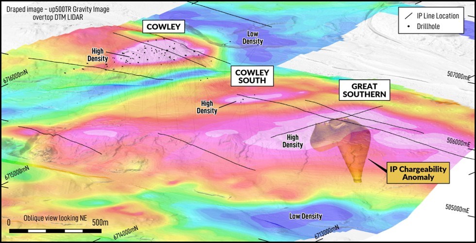 “At Great Southern, we’re preparing to drill what is a highly compelling, district-scale target. The gravity and IP anomaly there is not only significantly larger, but also stronger than the Cowley system response to the north. The northern portion alone covers an area approximately 2km by 1.2 km, and we believe this represents real potential for a significant new mineralized system within the broader Cowley corridor.”