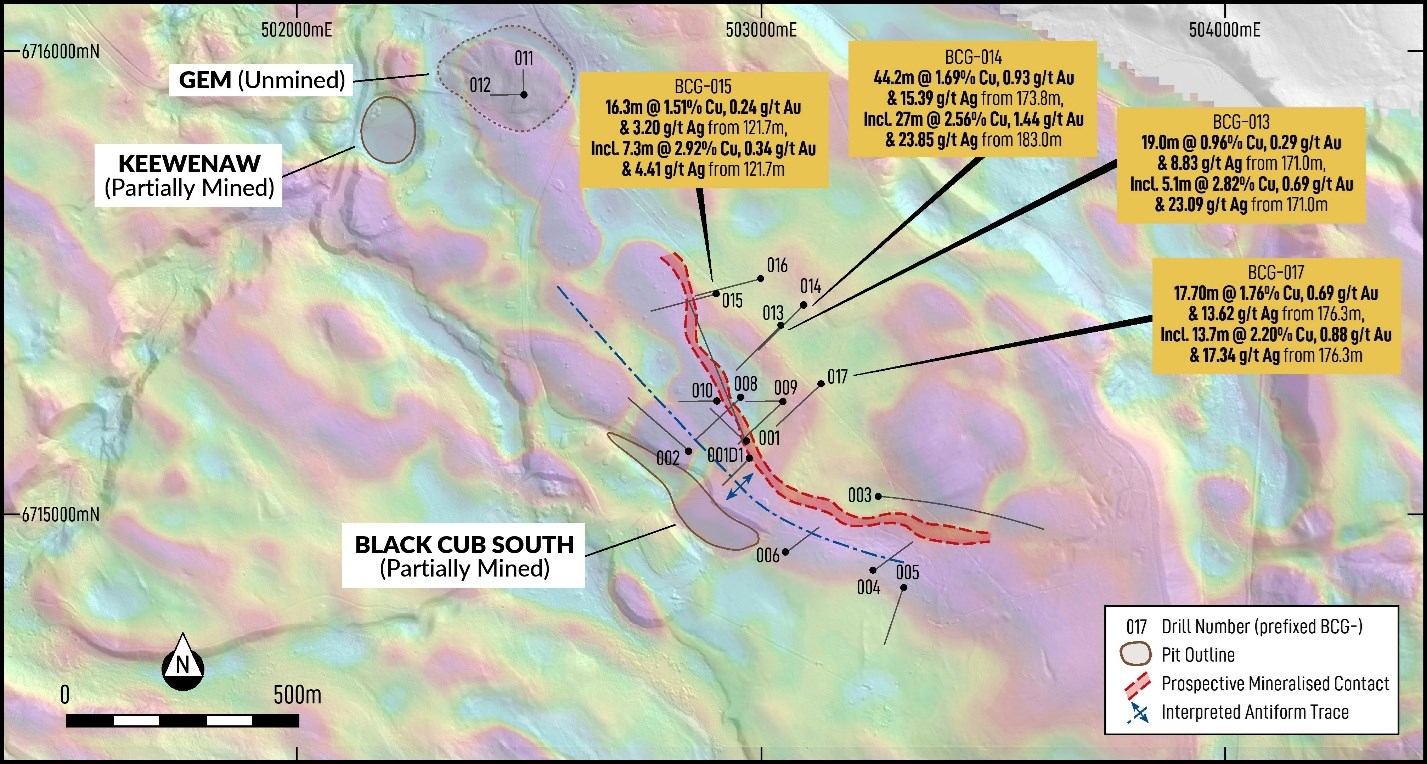 BCG-017 returned 17.70m @ 1.76% Cu, 0.69 g/t Au & 13.62 g/t Ag from 176.3m, including: