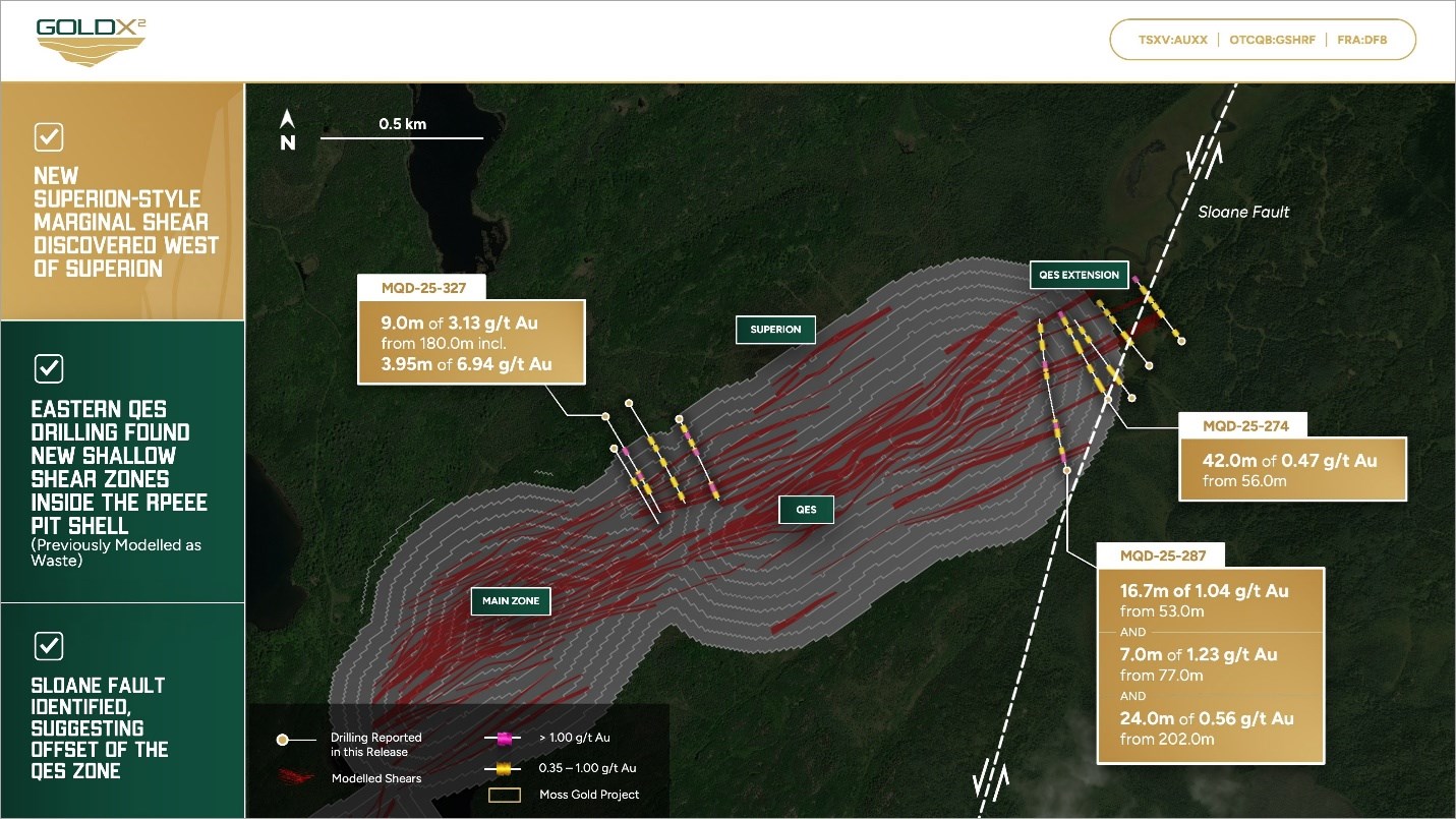 Michael Henrichsen, CEO of Gold X2 commented, “We are encouraged by the continued growth of high-grade mineralization at the Superion Zone, with drilling identifying additional mineralized shears along the northern edge of the deposit. Equally important, the intersection of mineralized shears within the QES Zone, in an area of the RPEEE pit previously modelled as waste in the PEA, underscores the project’s meaningful upside potential and the opportunity to enhance economics through lower strip ratios.”