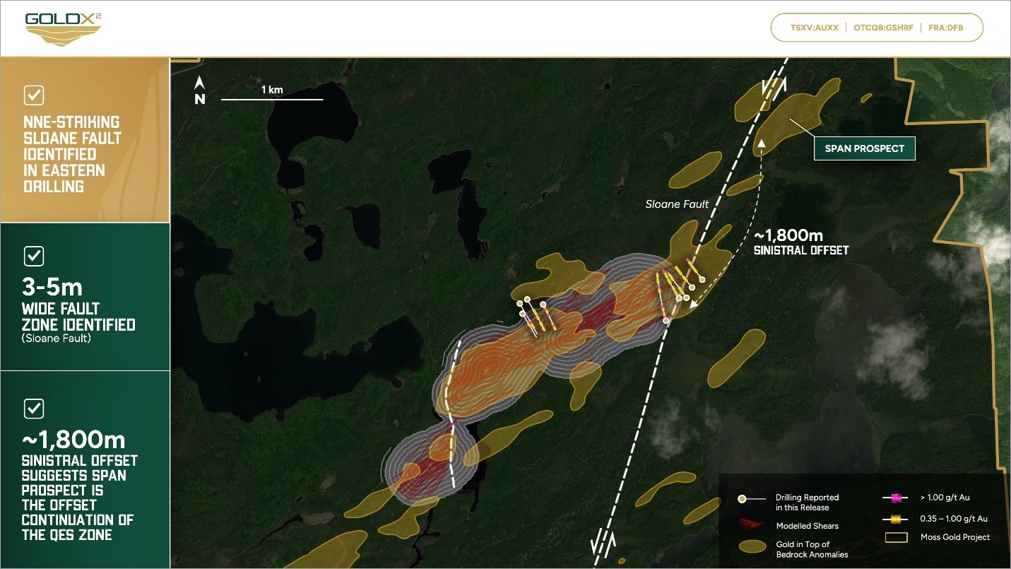 Five holes – MQD-25-244, -256, -269, -274 and -287 – were drilled to test the potential eastern extension of the QES Zone, which had previously been defined by low grade intercepts in historical drilling. These holes confirmed the results of historical drillholes but also discovered a 3- to 5-meter-wide NNE-striking fault zone, the Sloane Fault, that appears represent an 1,800m meter sinistral offset of the Moss Deposit. This indicates that the Span Prospect could be the probable offset extension of the QES Zone.