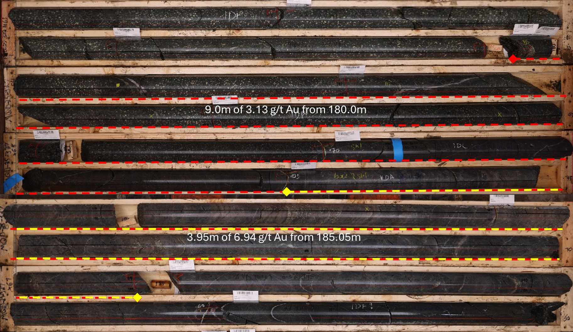 Figure 4: Hole MQD-25-327: Sheared and silicified contact between a porphyritic diorite dyke and dacitic volcanics yielding an intercept of 9.0m of 3.13 g/t Au from 180.0m, including 3.95m of 6.94 g/t Au.