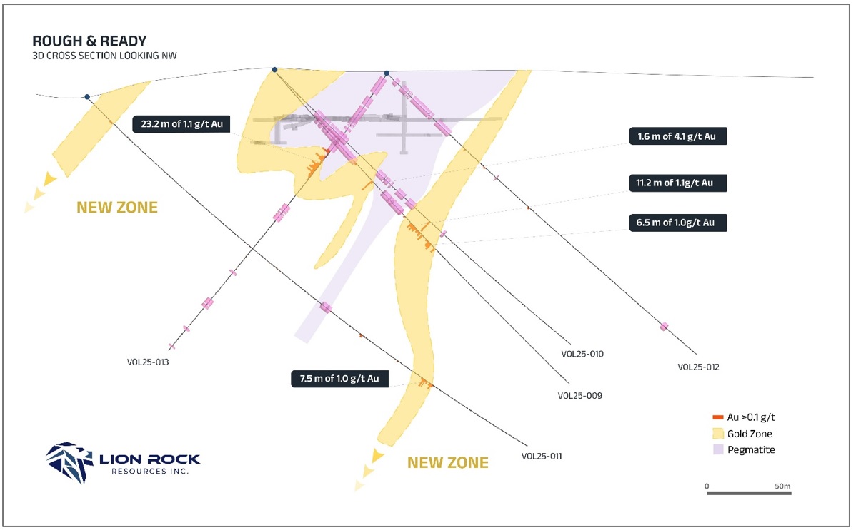 Dale Ginn, President and CEO of Lion Rock, stated, “This new gold discovery at Volney is a transformational result for Lion Rock. The fact that our very first round of drilling has established a strike approximately 500 meters long, 400 meters wide, and 200 meters deep, points to a richly mineralized gold system.