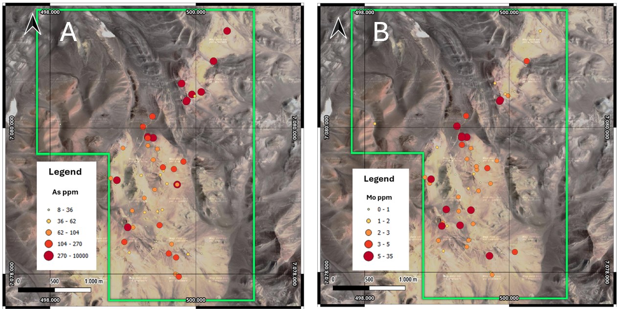 Die geochemischen Ergebnisse bestätigen eine weitläufige Anreicherung mit Arsen (As) im gesamten Projektgebiet mit lokalen Molybdän-Anomalien (Mo), was den hydrothermalen Zonenmustern entspricht, die in porphyrisch-epithermalen Systemen zu beobachten sind.