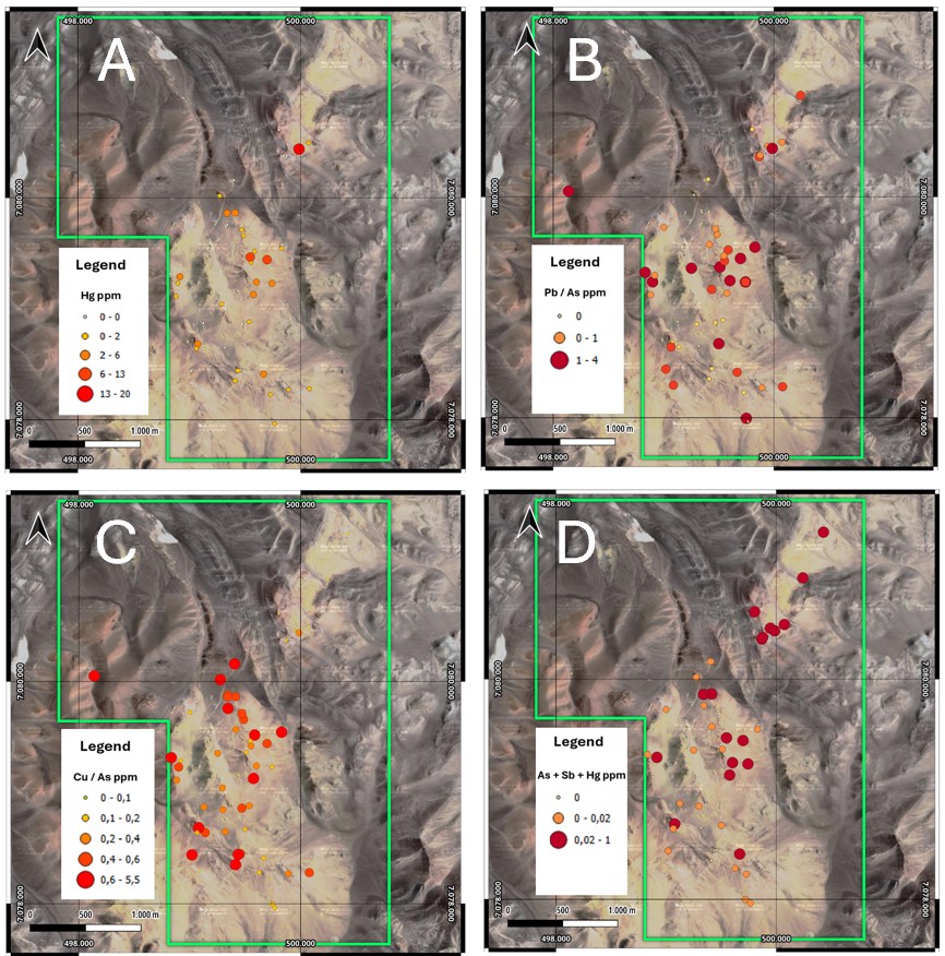 Abbildung 4: Entnahmestellen der Gesteinsproben in verschiedenen Farben für (A) Quecksilber-Konzentration (Hg), (B) Verhältnis von Blei zu Arsen (Pb/As), (C) Verhältnis von Kupfer zu Arsen (Cu/As) und (D) zusammengesetzte As+Sb+Hg-Reaktionen, was eine starke Anreicherung zeigt, die typisch für epithermale Systeme mit hoher Sulfidierung ist.