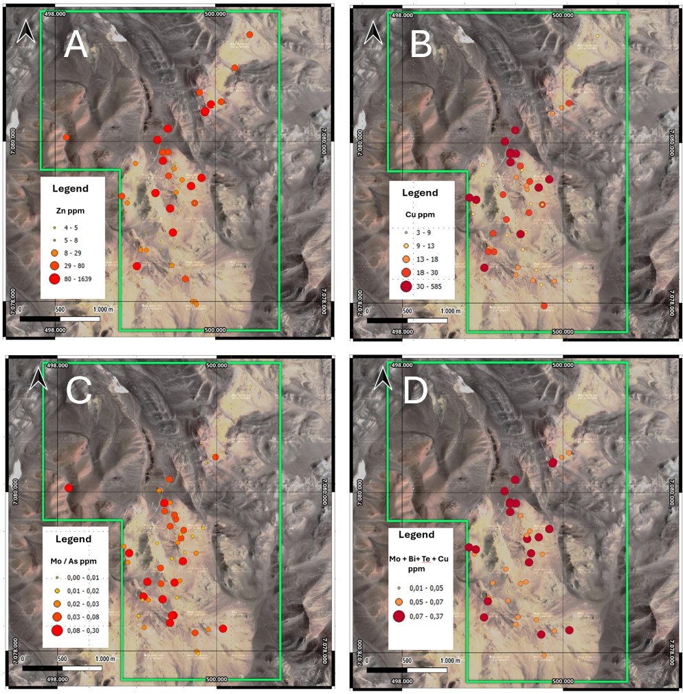 Zu den Indikatoren für Porphyr gehören Zink (Zn), das Verhältnis von Molybdän zu Arsen (Mo/As) und zusammengesetzte Multielement-Reaktionen mit Mo+Bi+Te+Hg, die einzelne Zonen definieren, die als potenzielle Zentren mit höherer Temperatur interpretiert werden und als potenzielle Vektoren, die auf eine tiefere Porphyr-Quelle hindeuten.