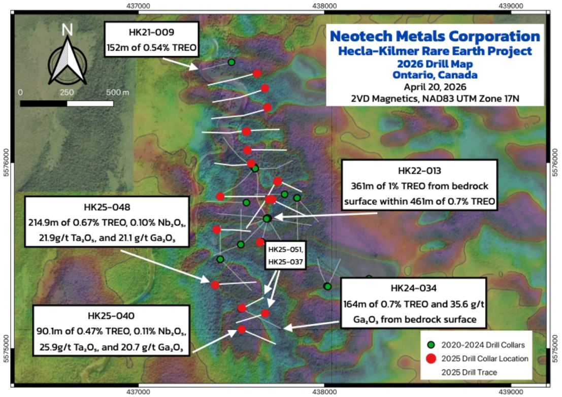 Vancouver, British Columbia–(Newsfile Corp. – April 21, 2026) – Neotech Metals Corp. (CSE: NTMC) (OTCQB: NTMFF) (FSE: V690) (“Neotech” or “the Company”) is pleased to report the first round of drill results from its 2025 drill campaign at its 100% owned Hecla-Kilmer Rare Earth Project in Ontario, Canada, where the Company completed 20 holes totaling approximately 8,000 metres of drilling and re-logged and re-assayed approximately 1,980 metres of historical core drilled by VR Resources Ltd., with those results expected to be incorporated into the Company’s Maiden Resource Estimate (“MRE”) in 2026.