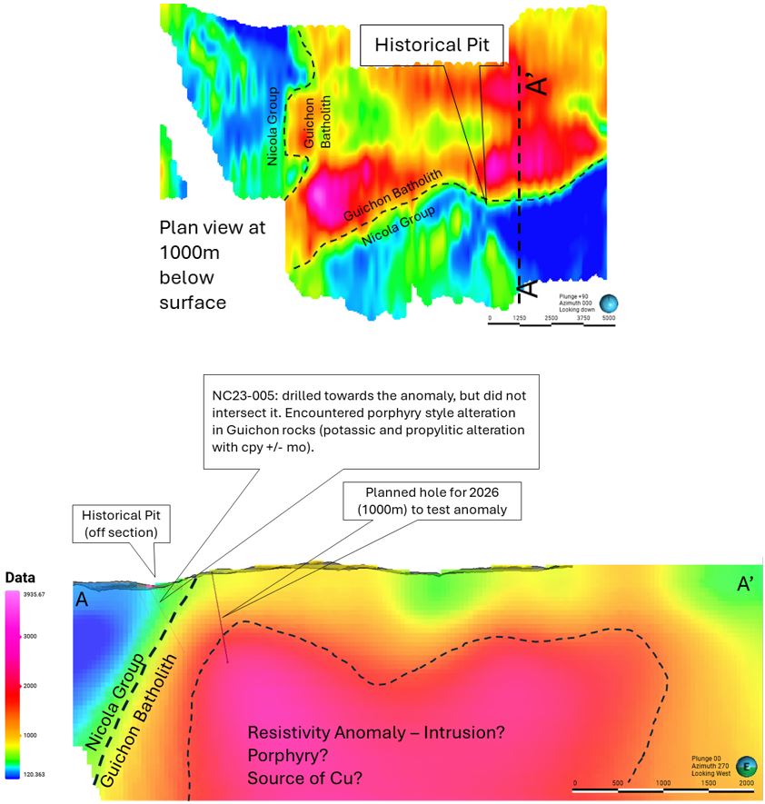 The planned drill hole is designed to test the interpreted ZTEM resistivity anomaly at depth, with the target zone expected to be intersected at approximately 775 metres downhole, based on the current geological model and assuming a drill orientation of approximately 80 degrees dip and the planned azimuth. This hole is intended to evaluate the potential presence of a causative intrusive body associated with the historical Craigmont copper skarn system.