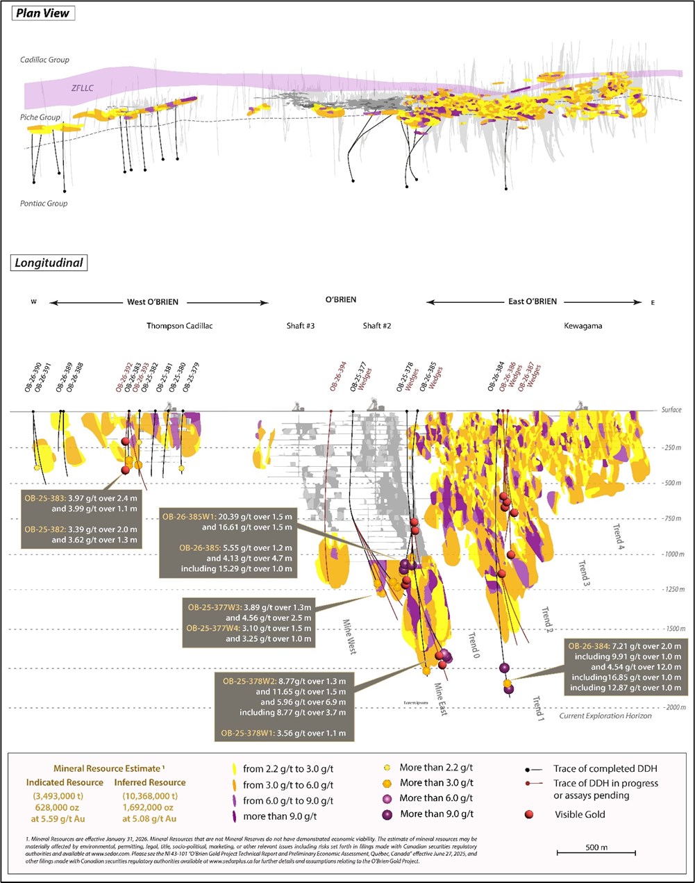• OB-26-384, le sondage le plus profond jamais foré au Projet aurifère O’Brien, a recoupé 4,54 grammes par tonne (« g/t ») en or (« Au ») sur 12,0 mètres (longueur carotte), incluant 16,85 g/t Au sur 1,0 mètre, 12,87 g/t Au sur 1,0 mètre et 7,21 g/t Au sur 2,0 mètres, qui inclut 9,91 g/t Au sur 1,0 mètre;