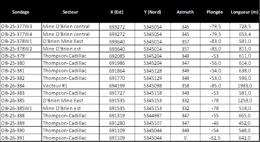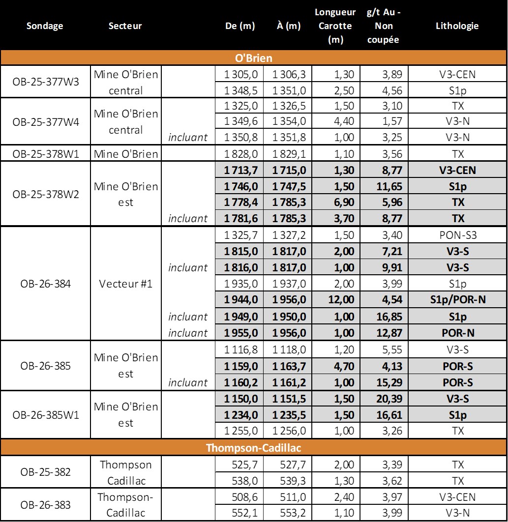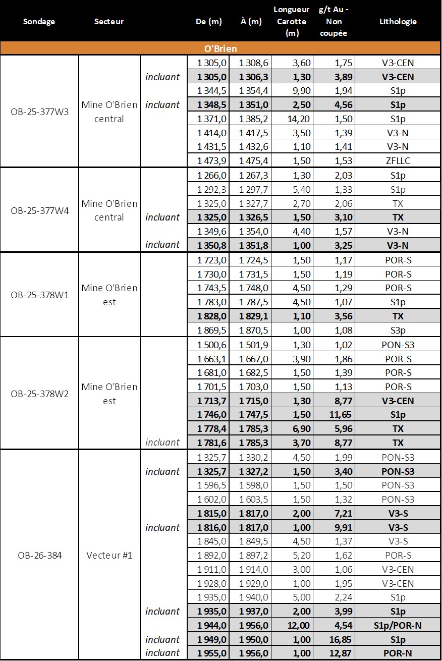 Tableau 2 : Résultats de forage publiés pour le Projet aurifère O’Brien depuis décembre 2024