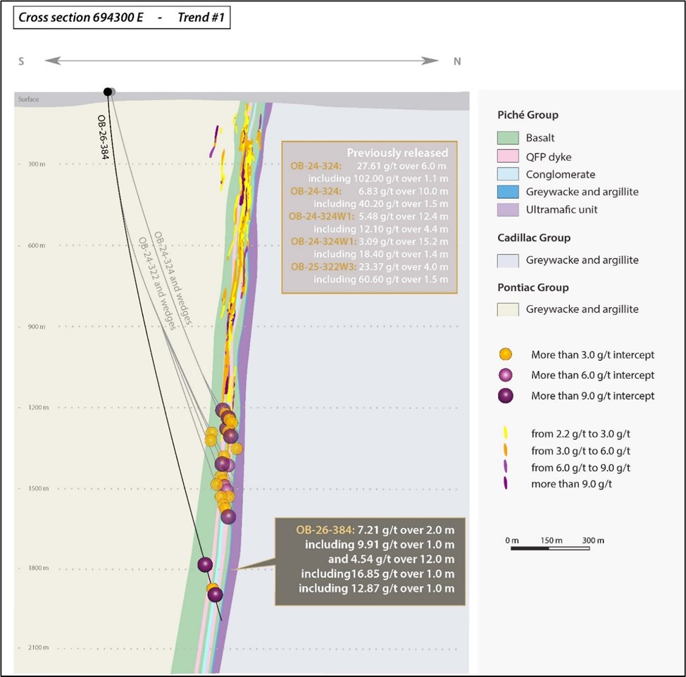 • OB-26-385 a recoupé 4,13 g/t Au sur 4,7 mètres, incluant 15,29 g/t Au sur 1,0 mètre, et 5,55 g/t Au sur 1,2 mètre;