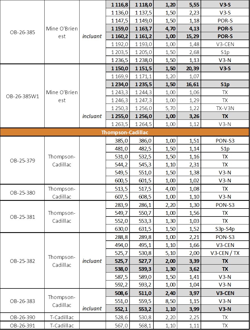 • OB-26-385W1 a recoupé 20,39 g/t Au sur 1,5 mètre, et 16,61 g/t Au sur 1,5 mètre;