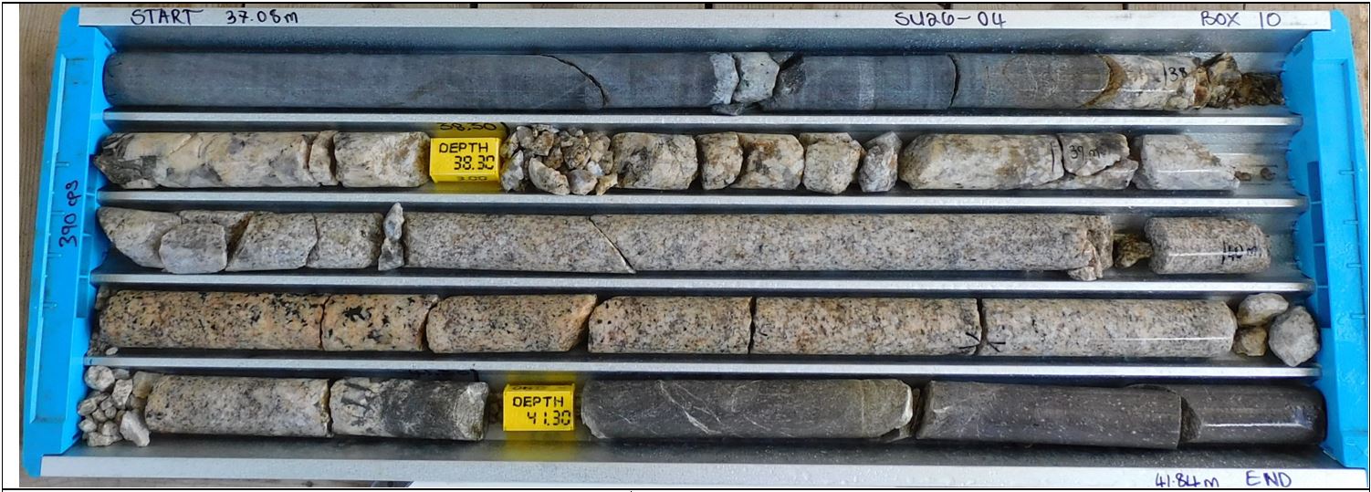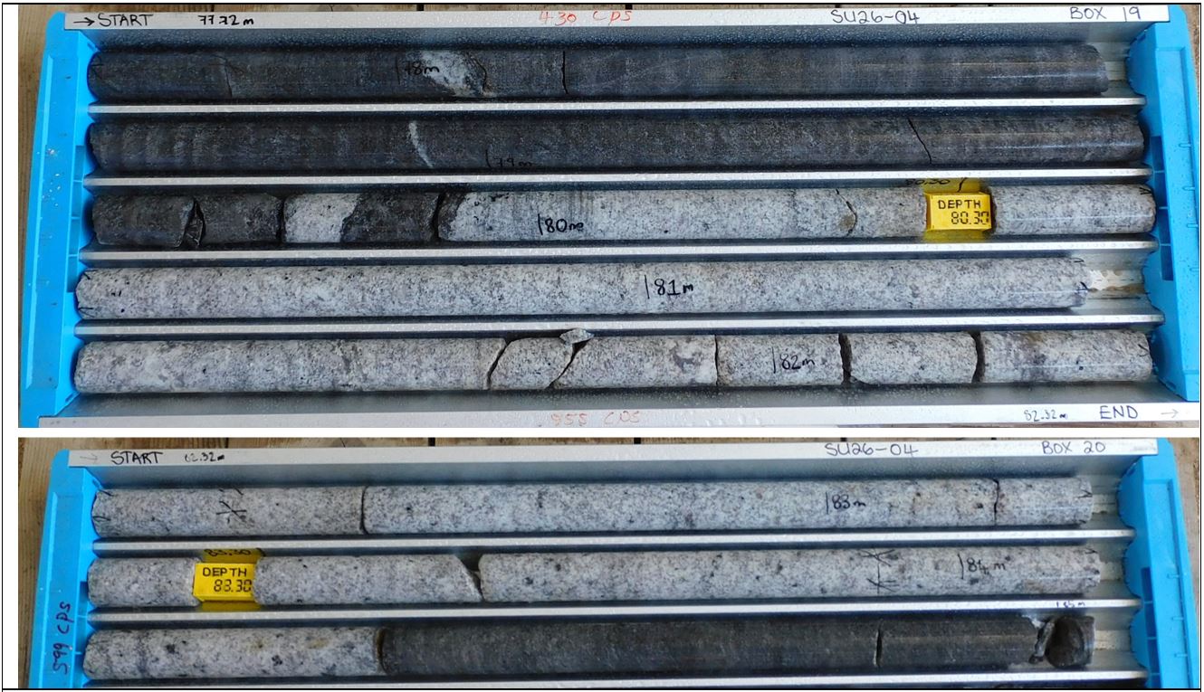- 577 cps over 4.20 m from 80.00 to 84.20 m (drill hole SU26-04)