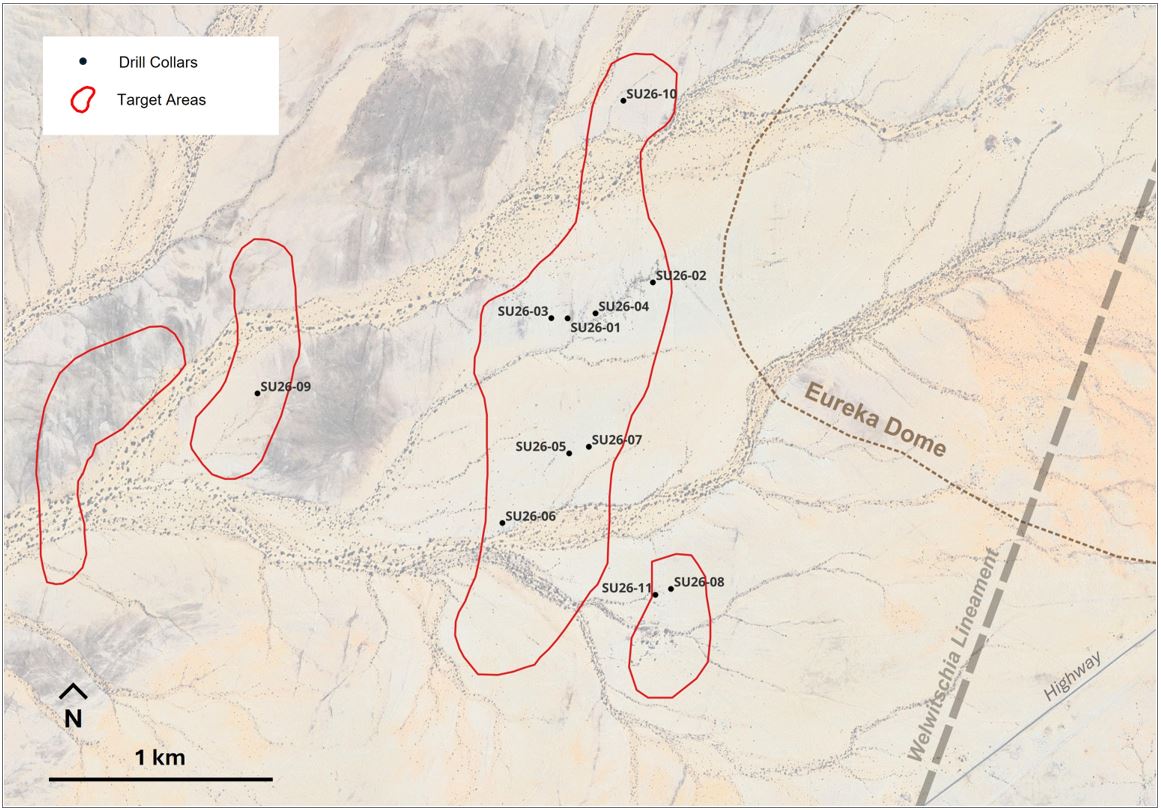 “We are highly encouraged by the results from our first uranium drilling program at Eureka,” said Christopher Drysdale, Interim CEO. “The program has successfully validated our Rössing-style exploration model, confirming the presence of the right rocks in the right structural settings, along with widespread elevated radiometric responses indicating the potential scale of the system. Importantly, we are seeing indications of both primary and near-surface uranium mineralization, highlighting the multi-target potential of the Project. We look forward to advancing these results with further downhole radiometrics and geochemical analysis.”