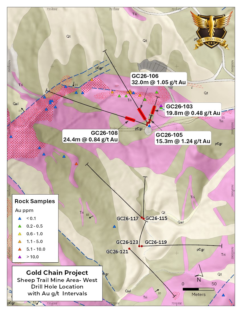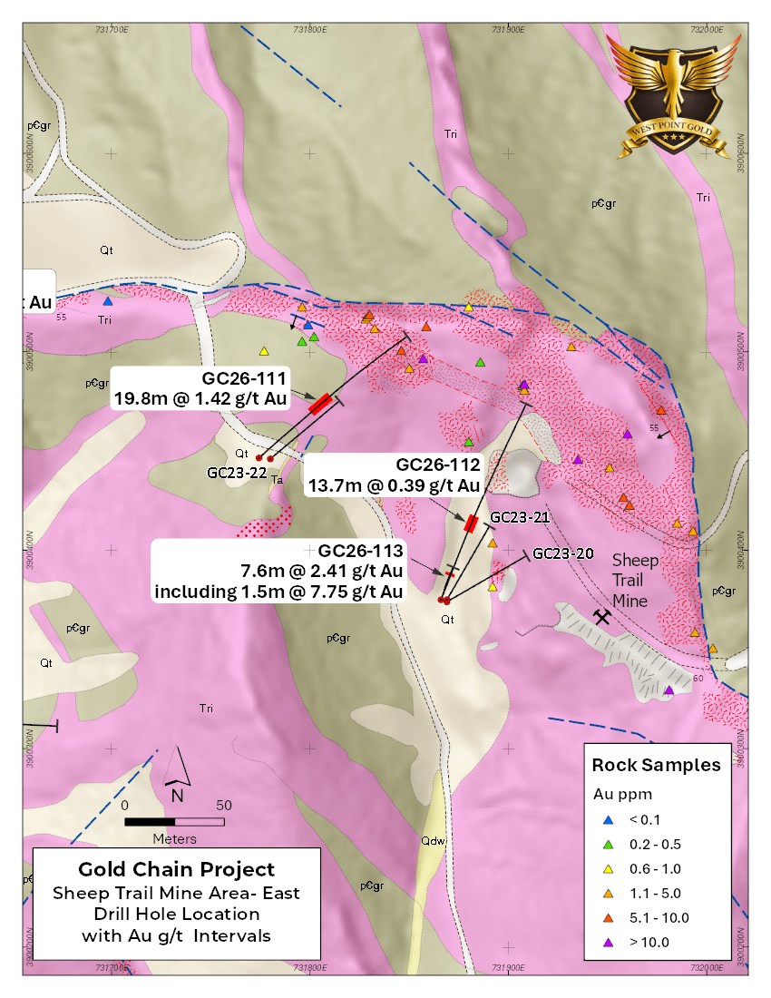 Source: https://www.newsfilecorp.com/release/291703/West-Point-Gold-Drills-32.0m-of-1.05-gt-Au-from-9.1m-at-Sheep-Trail-600m-StepOut-Supports-Third-Potential-Resource-Area-at-Gold-Chain