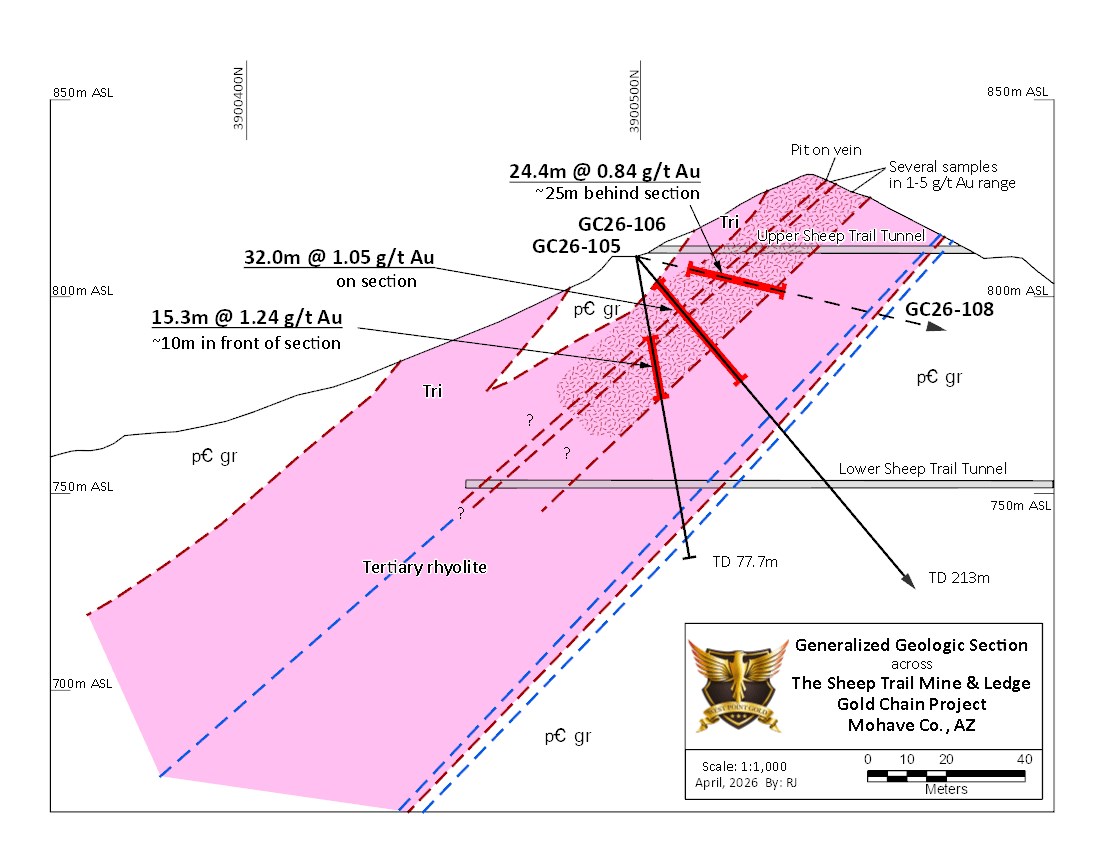 Several RC holes were drilled across accessible portions of the Sheep Trail target in areas where historical mine workings are widely scattered (see Figure 2A and 2B). These holes include GC26-103, GC26-105, GC26-106 and GC26-108 across the western extent of the mineralized zone (Figure 2A) and holes GC26-111, GC26-112 and GC26-113 further to the east (Figure 2B) and across what is referred to as the ‘Golden Elbow’ (Figure 2B). The target zone is shallow and within 60m of the surface; a couple of holes were extended deeper to test the possibility of additional veins in the Precambrian granite. To date, all gold mineralization is contained within the major rhyolite dike complex or at the contact with the Precambrian basement (Sheep Trail ledge).