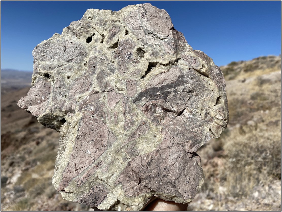 Mineralization in the holes drilled to date at Sheep Trail occurs as narrow (<5mm) white quartz veinlets over much of the dike complex. Within this envelope of generally barren, white quartz veinlets is a later quartz stage defined by lime green quartz-chalcedony veinlets, stockwork and breccia (Figure 4), which hosted high grades (up to 5 ounces per ton Au) in the historical Sheep Trail mine. Additional quartz events include white-to-gray sucrosic quartz veins and breccia with low gold values.
